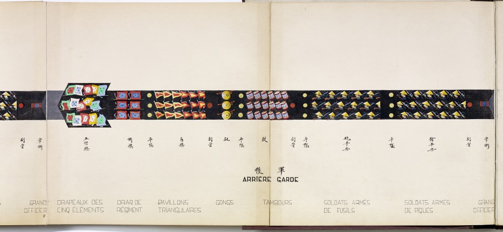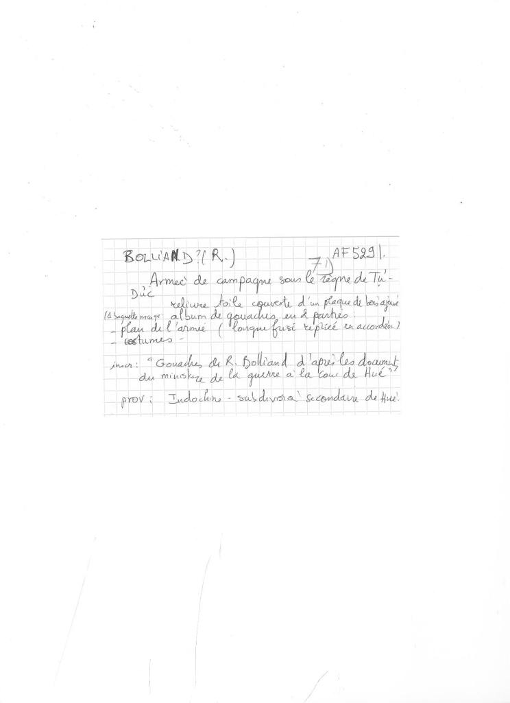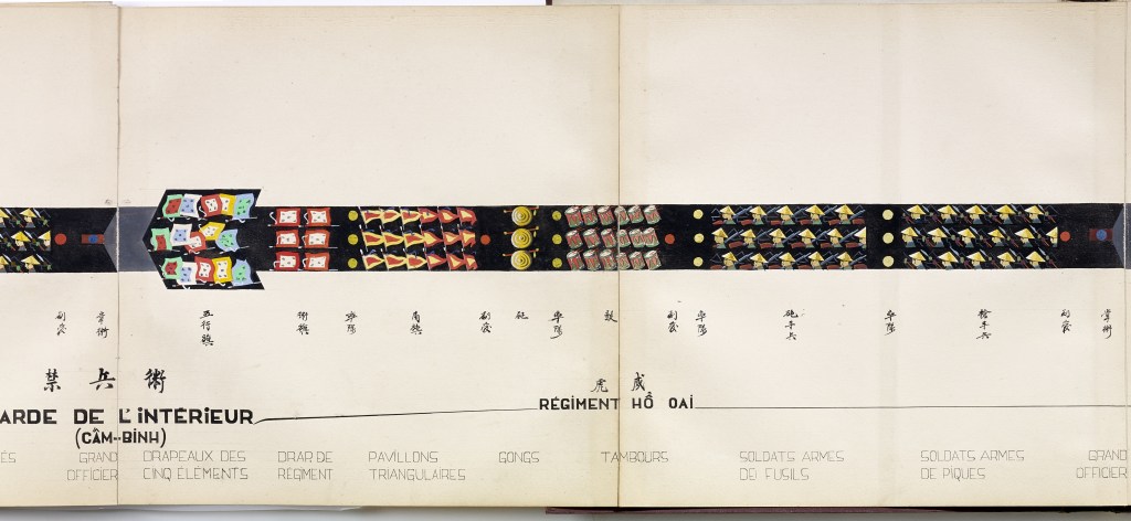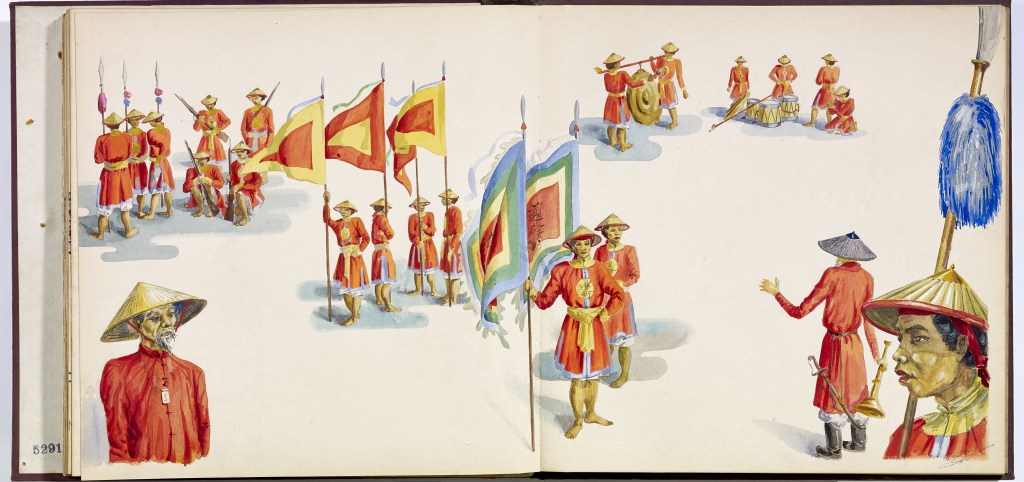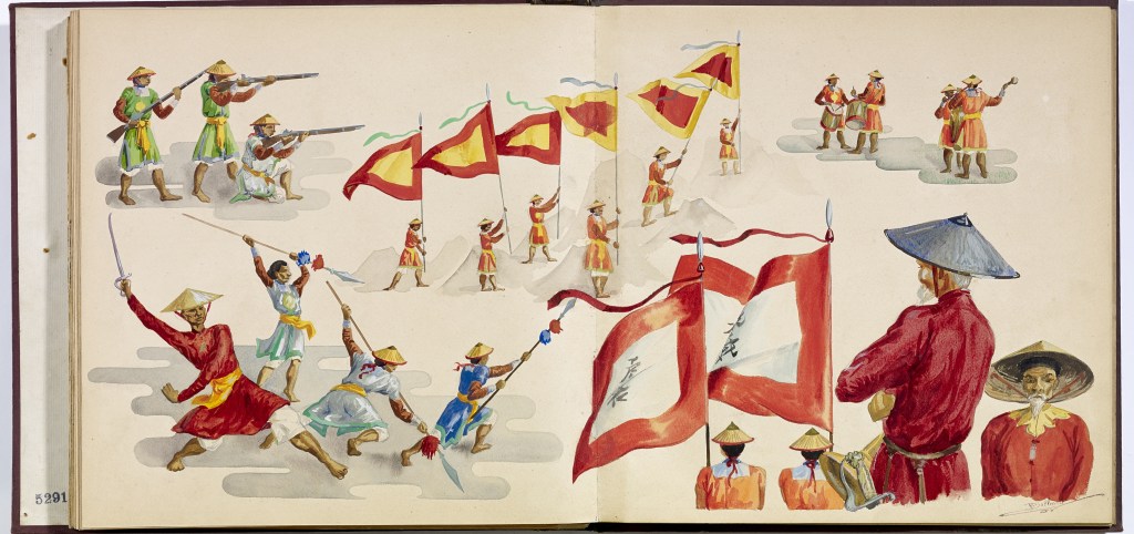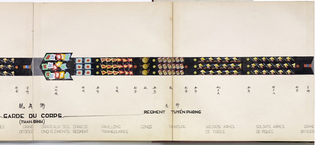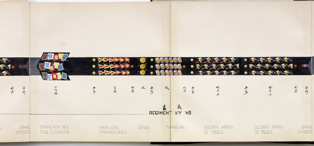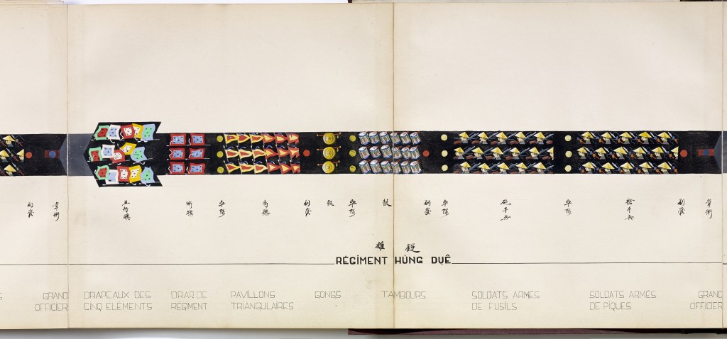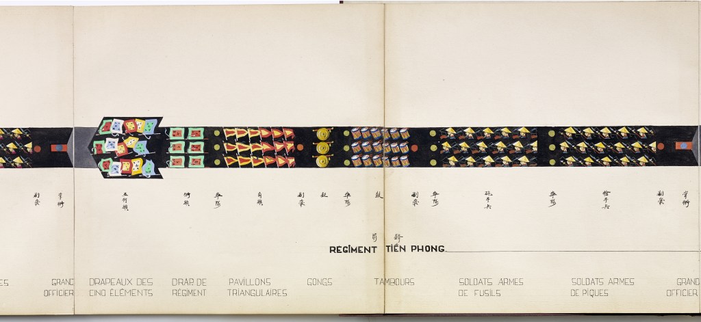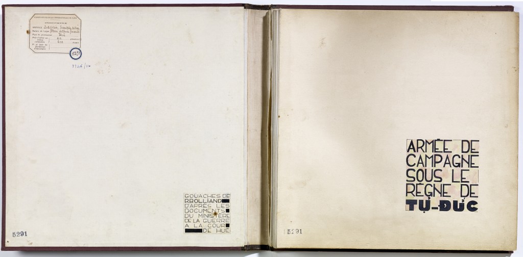 Album “Armée de campagne sous le règne de Tu’ Duc” d’une quarantaine de dessins réalisés par R. Bolliand, montrant des plans de l’armée, les différents costumes et drapeaux. Dans la première partie les feuilles sont reliées partiellement sous forme d’une longue frise repliée en accordéon.