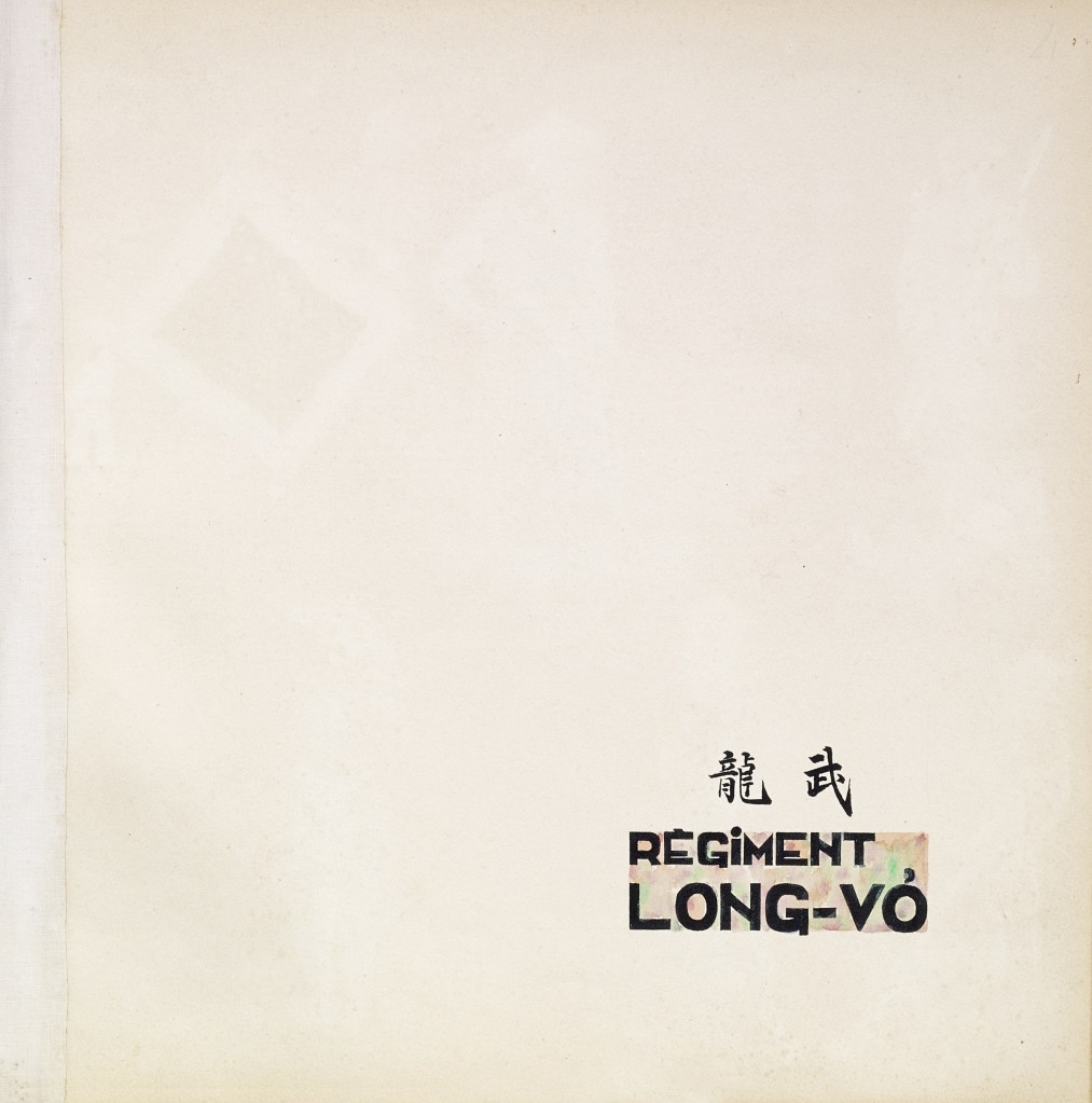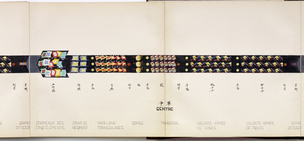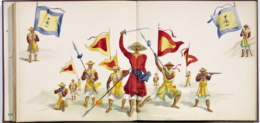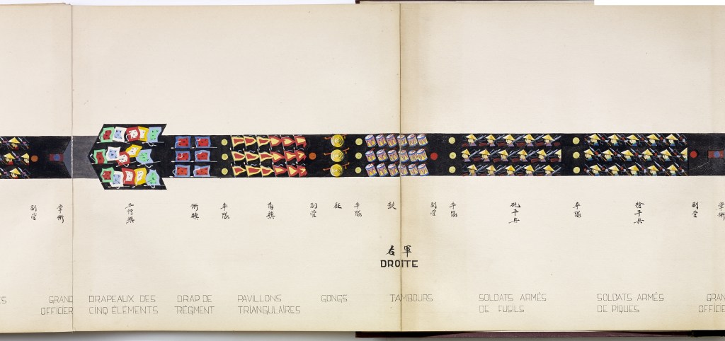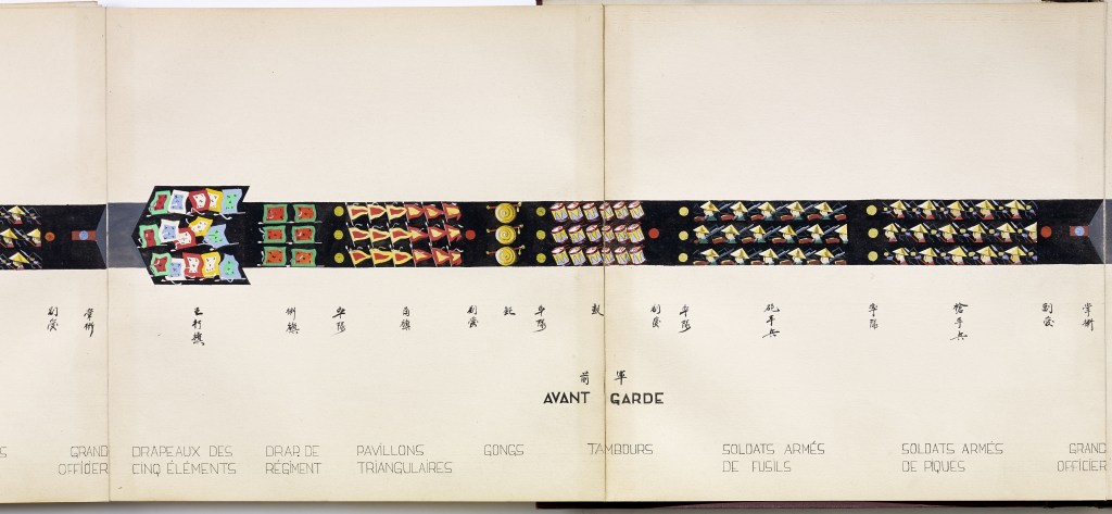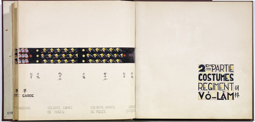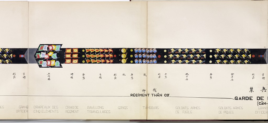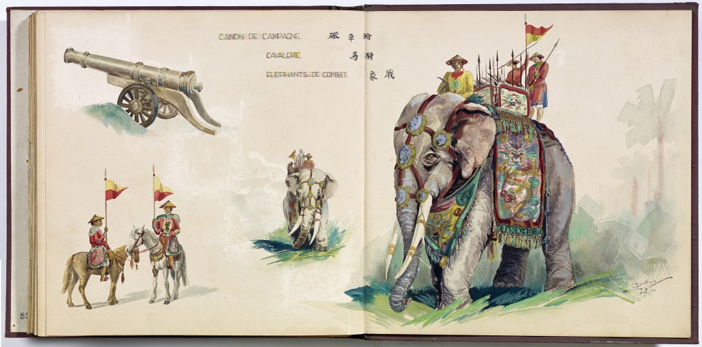 Album “Armée de campagne sous le règne de Tu’ Duc” d’une quarantaine de dessins réalisés par R. Bolliand, montrant des plans de l’armée, les différents costumes et drapeaux. Dans la première partie les feuilles sont reliées partiellement sous forme d’une longue frise repliée en accordéon.