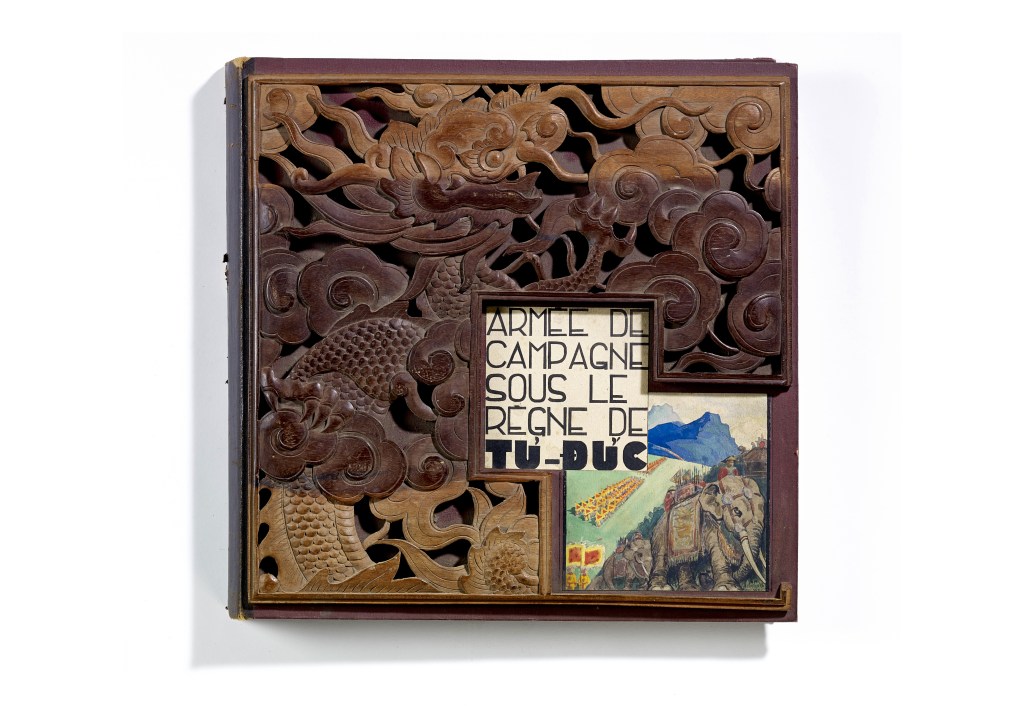 Armée de campagne sous le règne de Tu’ Duc Dessinateur : R. Bolliand ; Géographie : Hué Date : 1847-1888 Matériaux et techniques : Album de gouaches en deux parties. Reliure en toile couverte d’une plaque de bois ajouré et d’une gouache, dos en cuir. Dimensions et poids : Dimensions de l’album : 36,5 x 36,5 x 5,3 cm. Dimensions de la frise dépliée : 945 cm x 34,9 cm. Poids de l’album : 3228 g Collecte : Participation de l’Armée, Exposition coloniale de 1931 Album “Armée de campagne sous le règne de Tu’ Duc” d’une quarantaine de dessins réalisés par R. Bolliand, montrant des plans de l’armée, les différents costumes et drapeaux. Dans la première partie les feuilles sont reliées partiellement sous forme d’une longue frise repliée en accordéon.